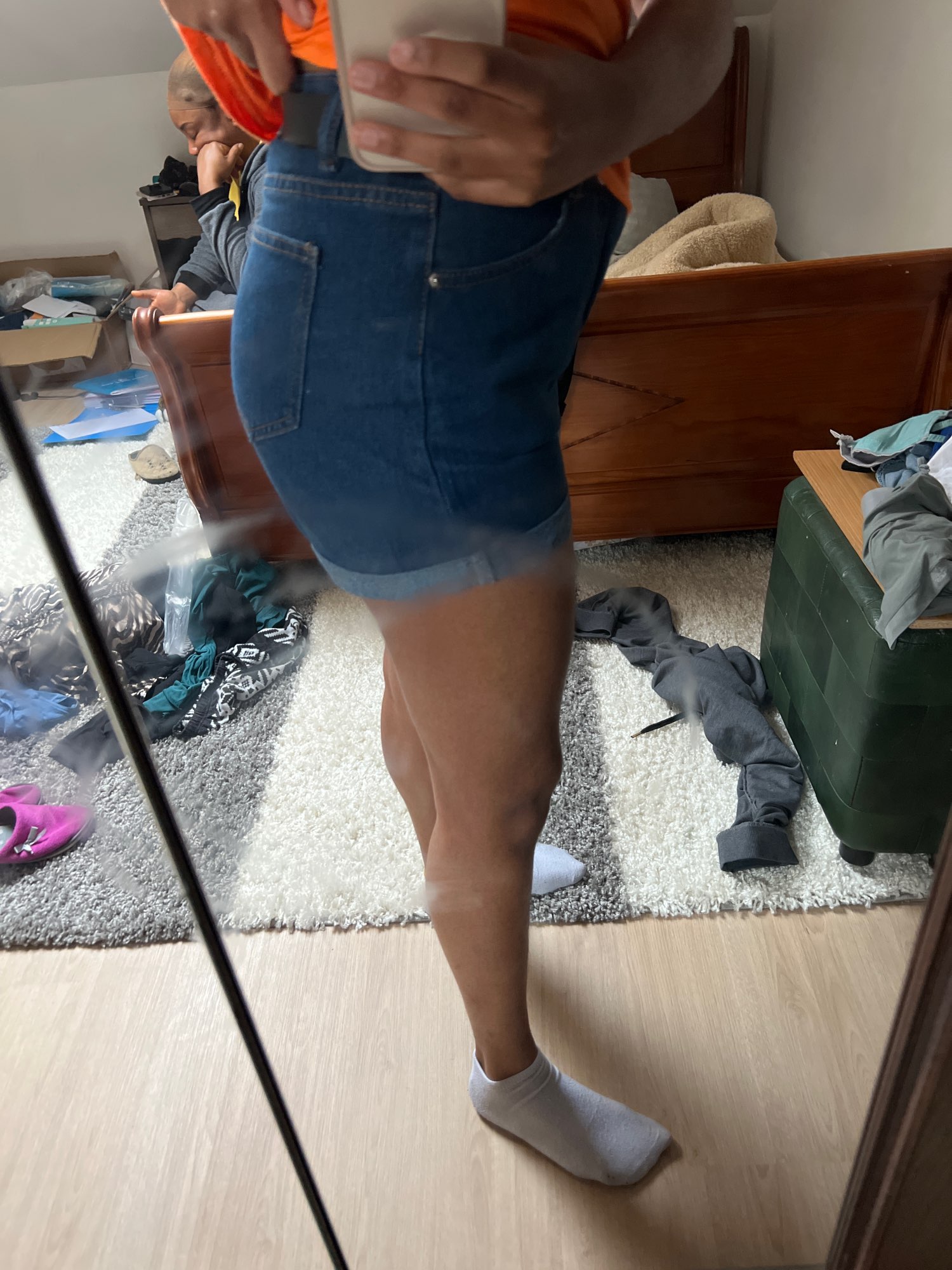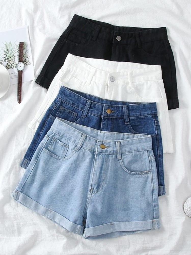 New classic blue denim shorts for summer. Girls wide leg, classic high waist blue denim shorts for casual use. Solid color white blue, blue and black loose jeans shorts.