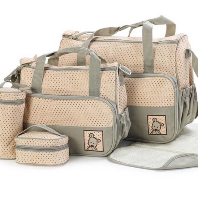 5pcs set baby diaper bag suitable for moms. This cute maternity diaper bag set contains Baby Bottle Holder, Mother Stroller Bag, Maternity Nappy changing mat, small lunch Bag.