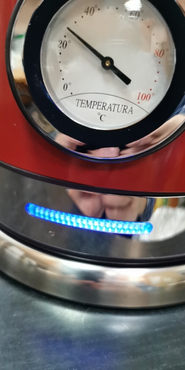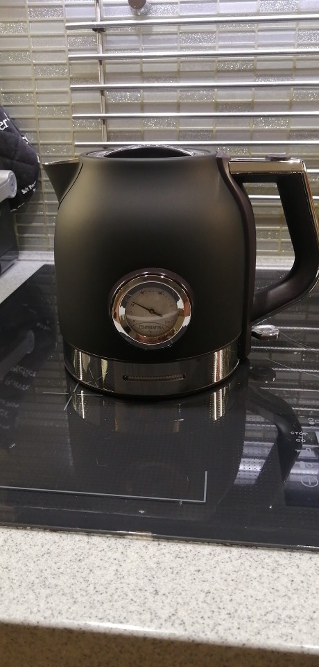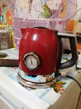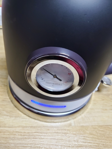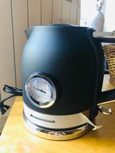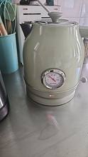 Olive green and retro white fast boiling electric kettle with water temperature meter 360-degree connector on the power base Automatic switch off, dry boil protection Durable waterproof temperature controller On/off switch