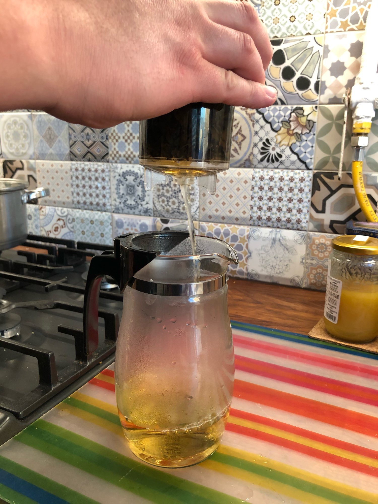 Чайничек маленький. Пользуюсь не привычно что вода заваривается в верхнем отсеке и ее надо сливать.