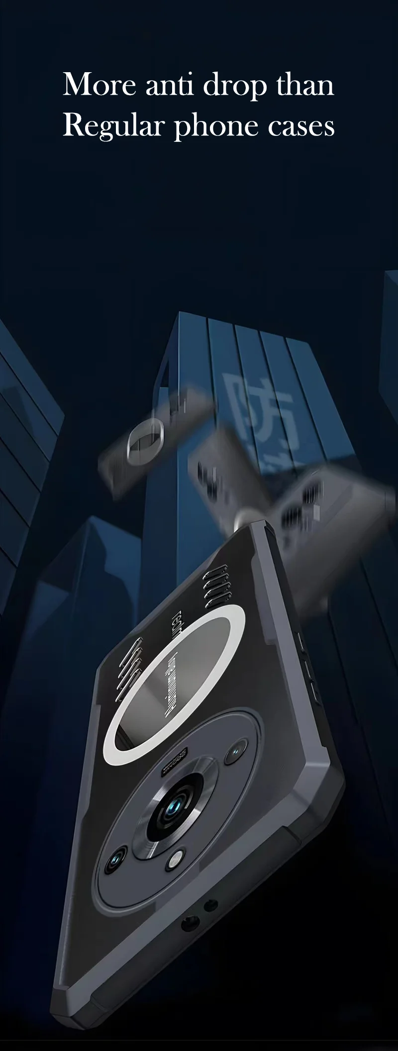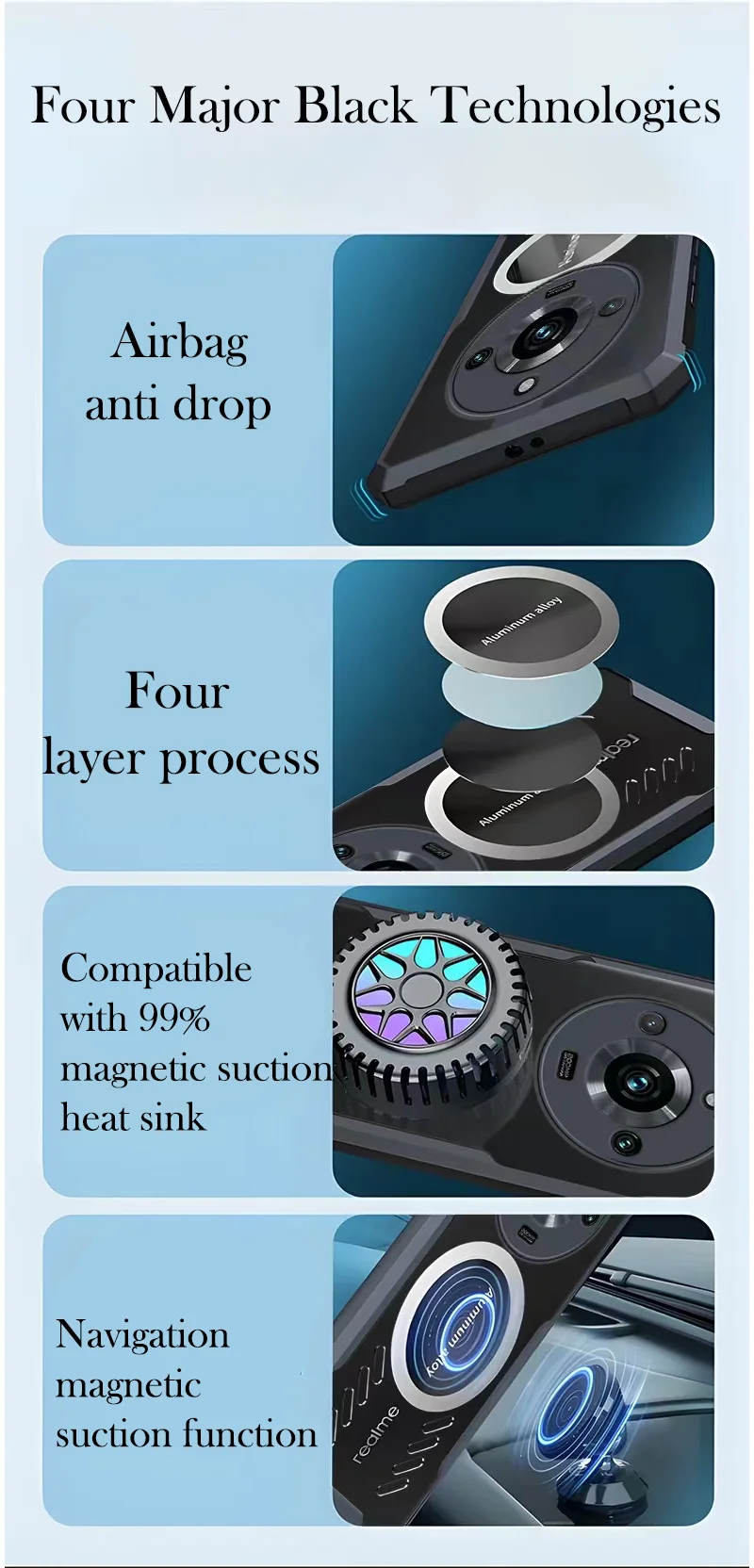 This phone case is equipped with an airbag for anti drop, which is more anti drop than a regular case. It is made of graphene aluminum alloy, which allows for faster heat dissipation and one second magnetic suction. It is compatible with 99% of magnetic suction radiators, upgraded for car magnetic suction, and anti fingerprint.The protective film on the back cover can be removed before use.