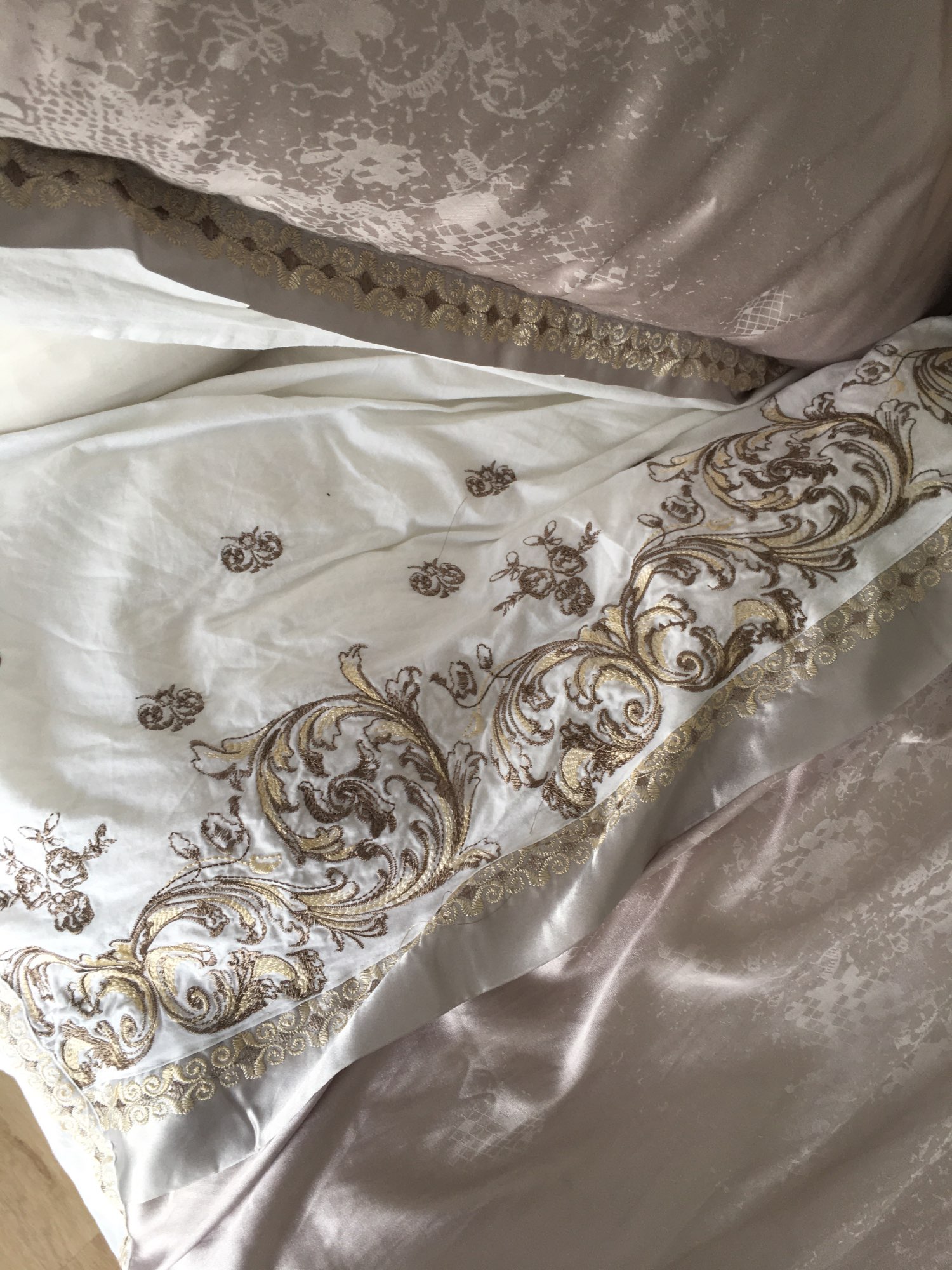 The duvet cover outer is made of stained jacquard fabric, with high count and density, silky and gloss inner is made of 100% natural cotton, with an embroidery process.