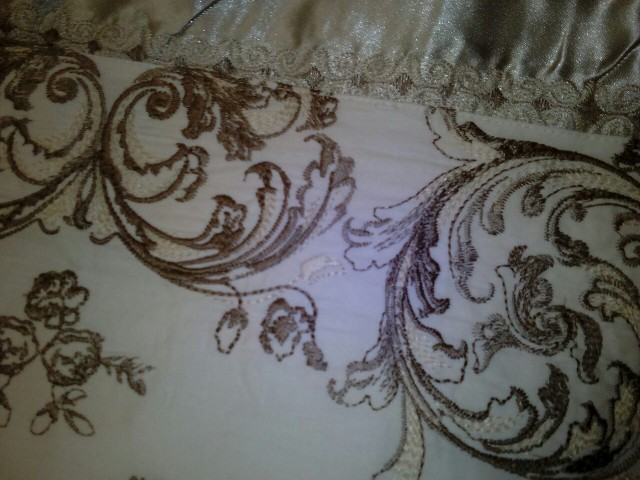 magnifique parure! matière et taille parfaite brillante et fraîche. agréable surprise. à laver à l envers à cause des détails délicats brodés sur dessus. si beau, suis fan absolu!