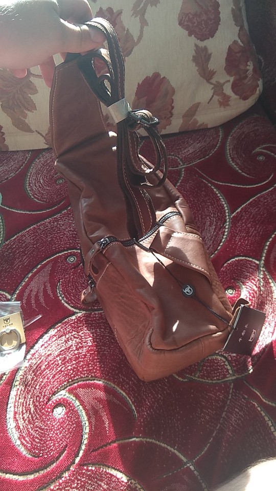 красивая сумка, много отделений, пахнет чють приятно натуральной кожей, цвет естественного оттенка, в подарок визитница, брелок и фиксатор для мобилки. доставка в украину 10 дней. удовлетворен заказом полностью. стильная эмблемка с рогами на сумке :)