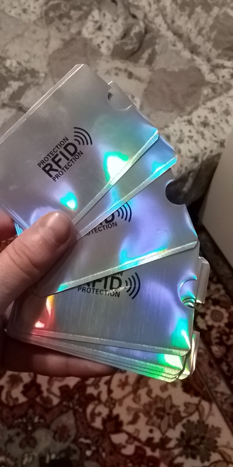 Защитные алюминиевые чехлы от считывания карт. Полезнейшая штука в 7 экземплярах за 2.19е. У меня есть кошелек - браслет, для транспортной карты, банковской, медицинской карт и удостоверения. И все они с чипами. Из-за этого транспортная карта плохо считывается при прохождении контроля, и ее нужно постоянно доставать из кошелька. Эти чехлы решают сразу две задачи - блокирование остальных карт в целях безопасности и нормальное считывание проездного билета. Это также- полезный подарок за очень символическую цену.