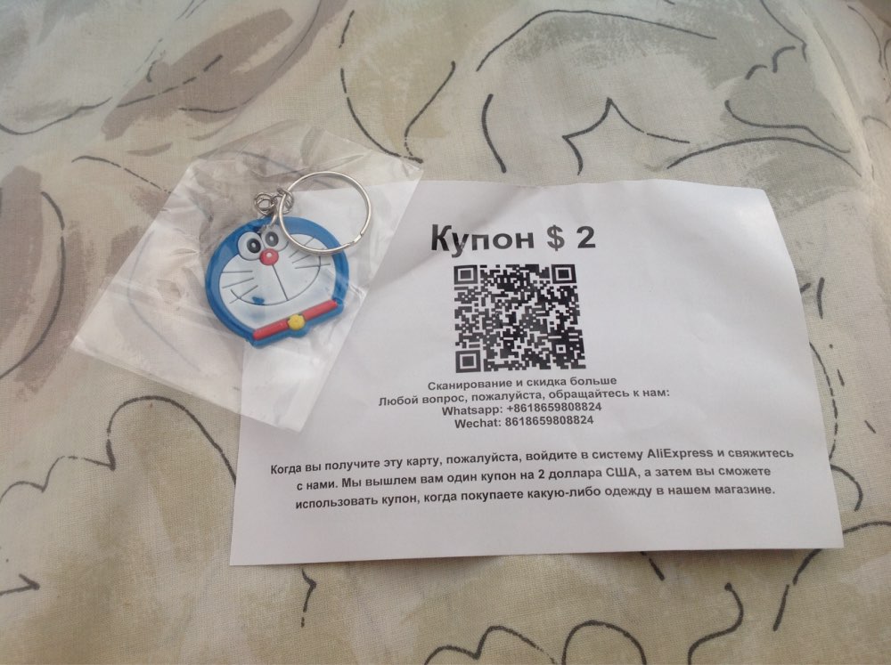 Товар хороший. Продавец положил подарок: купон на 2$ и брелок.