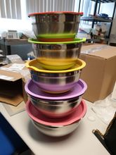 This mixing bowl set comes in 1.5, 2.5, 3,4, 5 quart different size bowls, they would meet your different needs on your home kitchen, restaurant and canteen, like prepping food, storing leftover, or mixing salads, beating egg or serving soup, Bowls are Oven and Mixer Safe