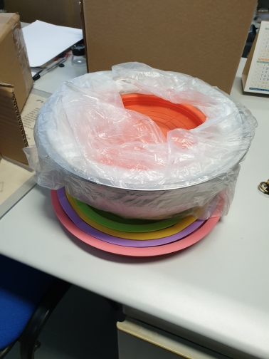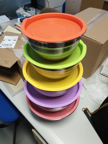 perfecto juego de cuencos metálicos con tapa, antideslizantes, de fácil manejo, envío rapidísimo, en cinco días lo tenía en casa, vendedor muy aconsejable.