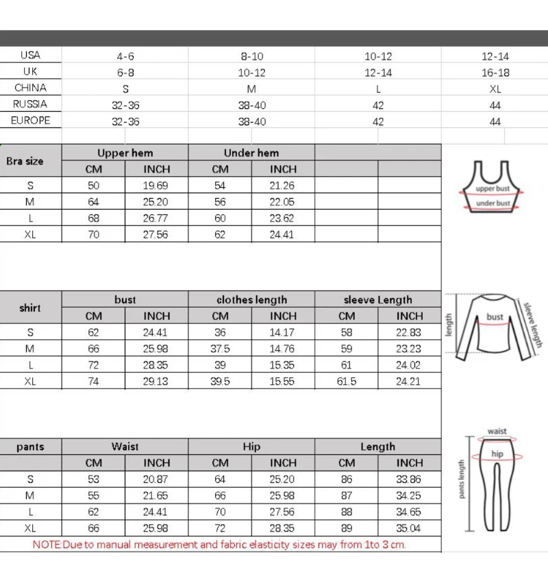 | Size | Bust (cm / inch) | Waist (cm / inch) | Top Length (cm / inch) | Pants Length (cm / inch) |
